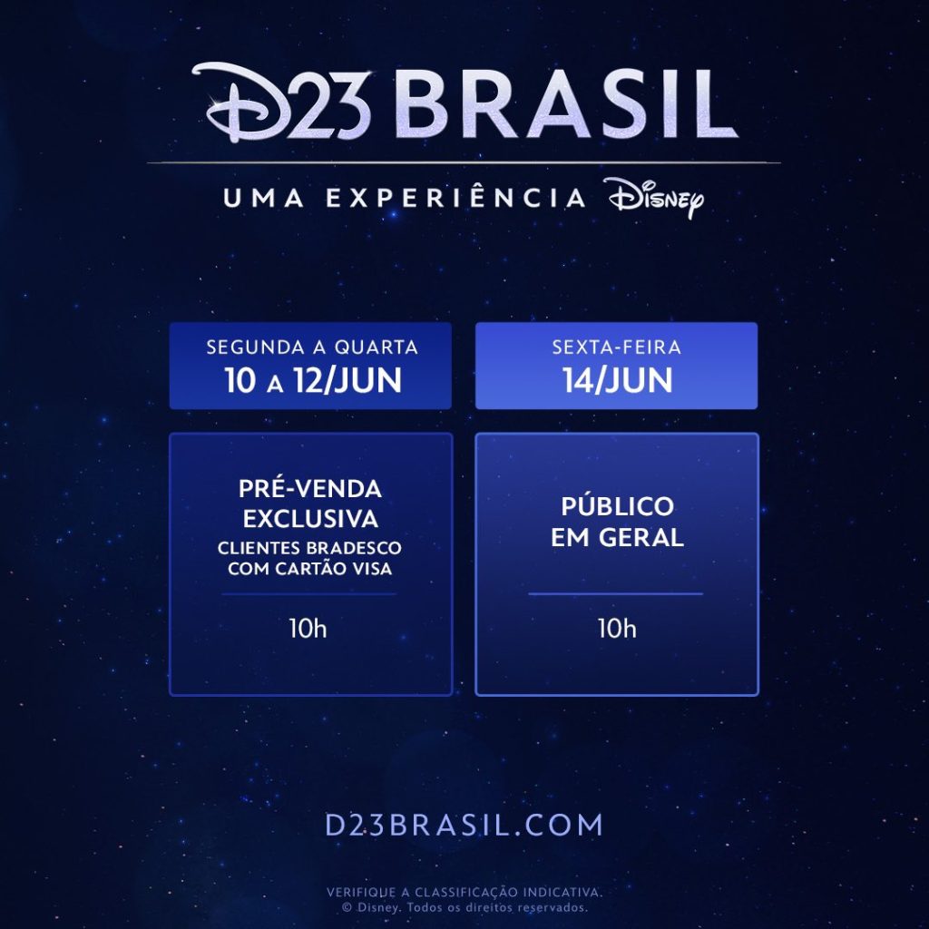 O evento, que conta com Visa e Bradesco como principais patrocinadores e Mercado Livre como loja oficial, terá sua pré-venda exclusiva de ingressos de 10 a 12 de junho para clientes dos cartões de crédito e débito Bradesco/Visa, pelo site da D23 Brasil. A venda para o público geral começará em 14 de junho, com preços a partir de R$174,95 até R$ 999 no pacote mais completo.