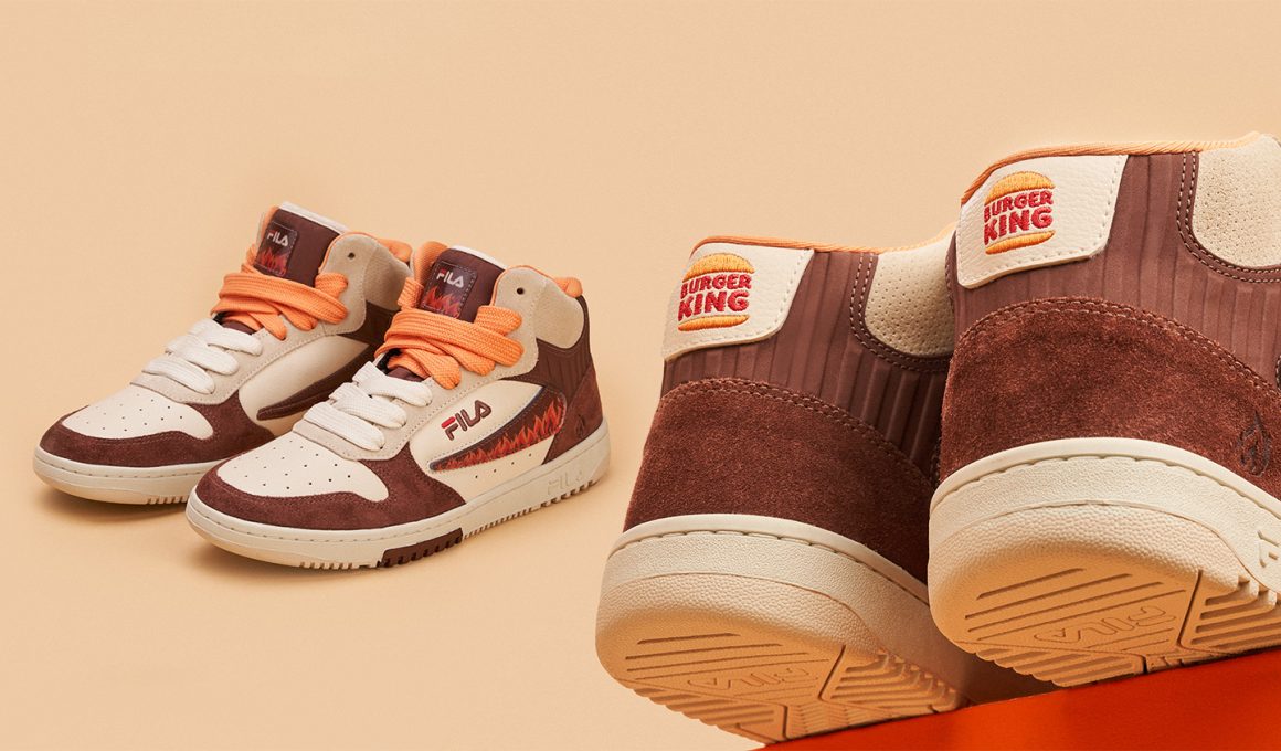 Com um shape em cano médio, a novidade chega com um mix de cores criadas a partir da paleta tradicional do Burger King (laranja e marrom) e o off-white clássico da FILA. Outro destaque é a etiqueta tazo no cadarço, que eleva a originalidade dos detalhes em couro craquelado e a textura que simula a grelha da rede de fast food. Além disso, o sneaker vem com uma flag removível que possibilita a personalização do modelo. A coleção ainda conta com boné, bucket hat, meias e uma shoulder bag (com logo personalizado) inspirada na famosa “carne grelhada no fogo” do Burger King®.